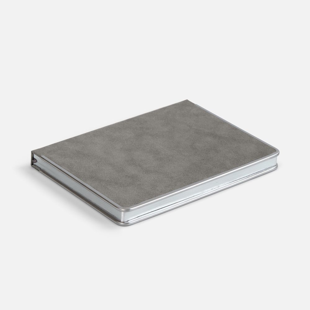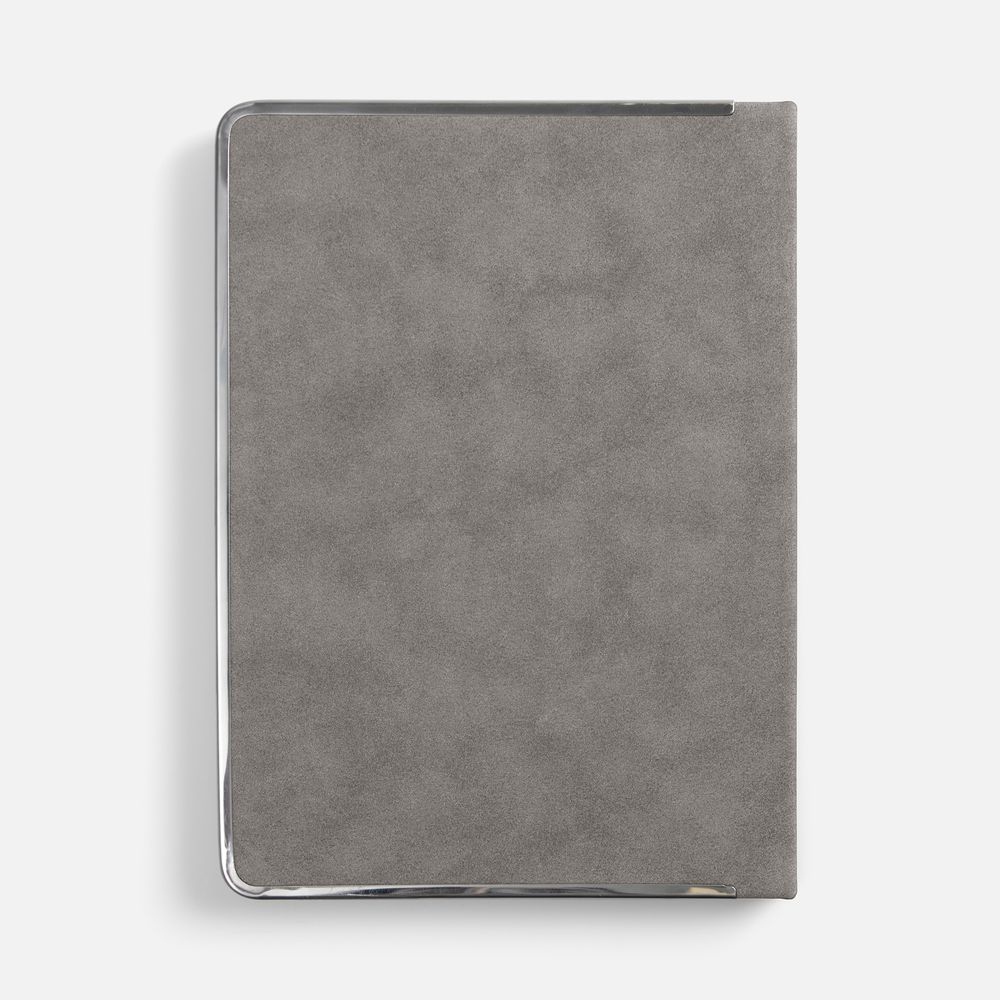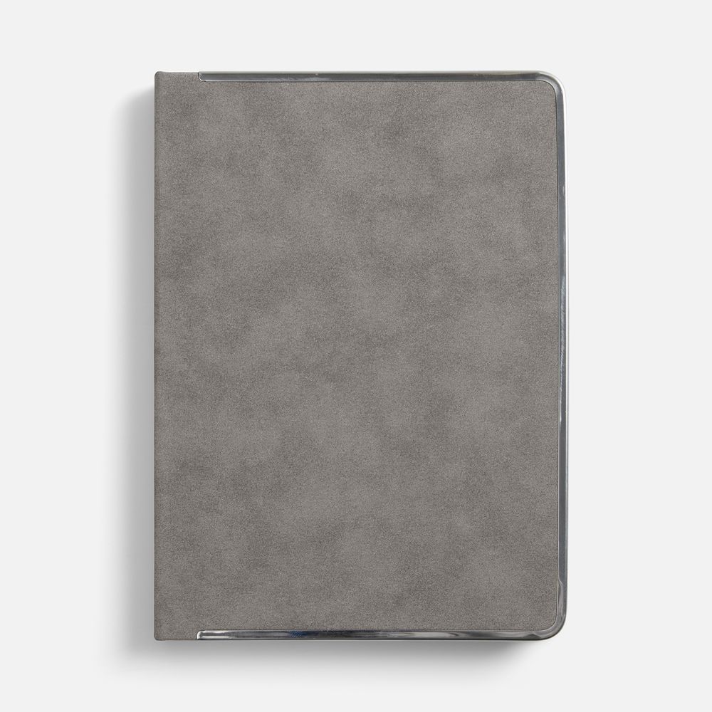 Ежедневник с твердой обложкой и серебристым  обрезом блока. Выполнен из материала Nubuck, серый СС, дополнен серым ляссе и металлическими рамками с двух сторон обложки.