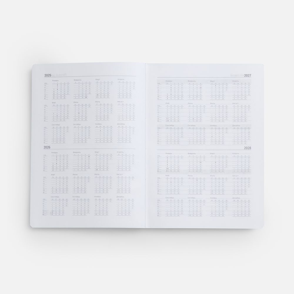 Ежедневник с твердой обложкой, выполнен из материала Latte, серый СС, обрез серого цвета, дополнен ляссе серого цвета и резинкой с металлическим шильдом.