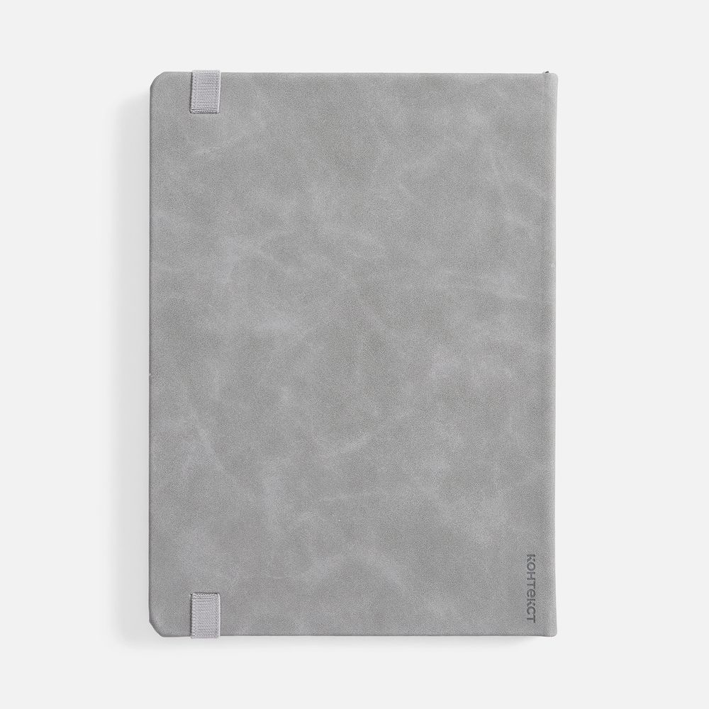Ежедневник с твердой обложкой, выполнен из материала Nubuck Touch, серый СС, дополнен ляссе темно-серого цвета.