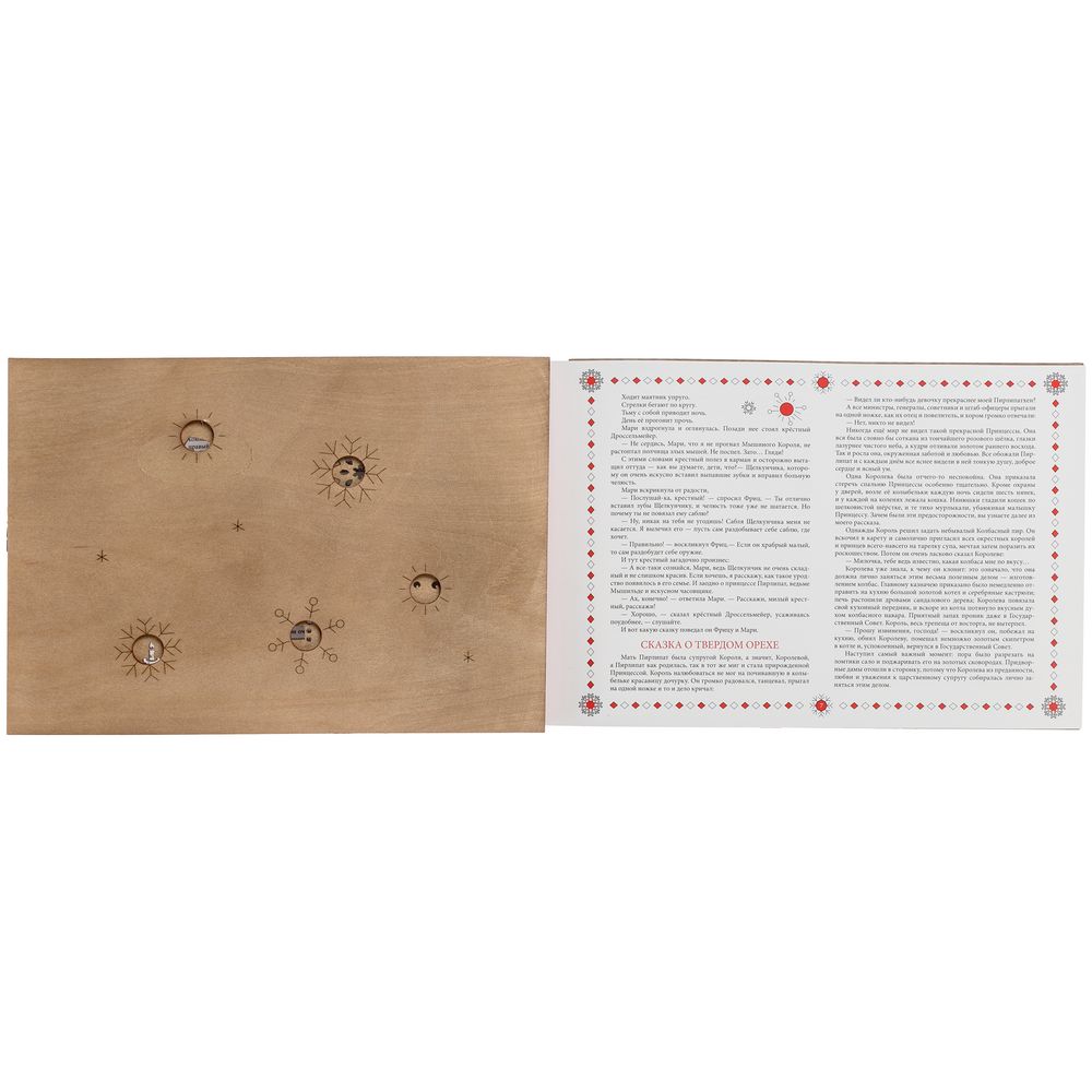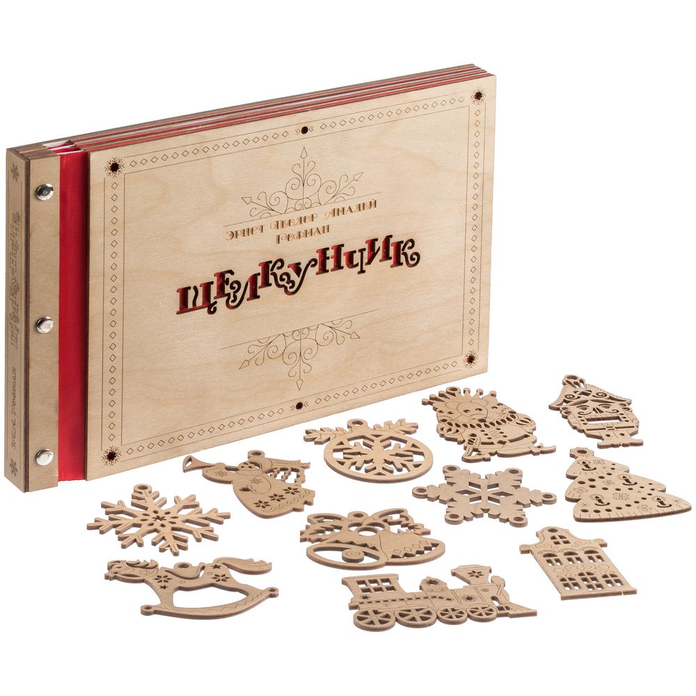 Новогодняя книга «Щелкунчик» способна вызвать тот неповторимый трепет от встречи с чем-то волшебным. Это сразу два чудесных подарка в одном необычном воплощении: резную книгу можно не только читать, любуясь каждой страницей, но и преобразовывать в настоящие деревянные елочные игрушки. Так история оживает прямо на глазах — как в лучших сказках и самой богатой фантазии, а сам презент впечатлит оригинальной задумкой и исполнением.В наборе книга Э.Т.А. Гофмана «Щелкунчик» в сокращении и 11 деревянных подвесок на елку.