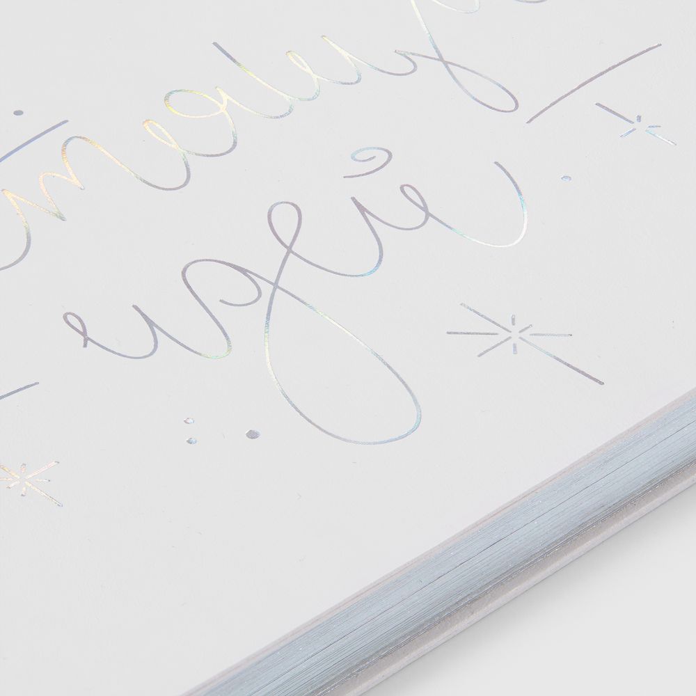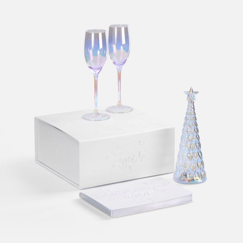 Секрет прост: это особенное перламутровое напыление бокалов и стеклянной елочки-светильника, а еще серебристое голографическое тиснение на самой упаковке и ежедневнике с главным — и всегда актуальным — пожеланием. В такой компании блестящие идеи, без сомнения, будут посещать намного чаще, чем обычно, а весь год будет окрашен в яркие тона, искрящиеся радостью!