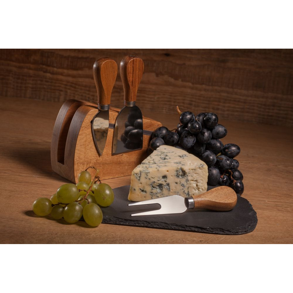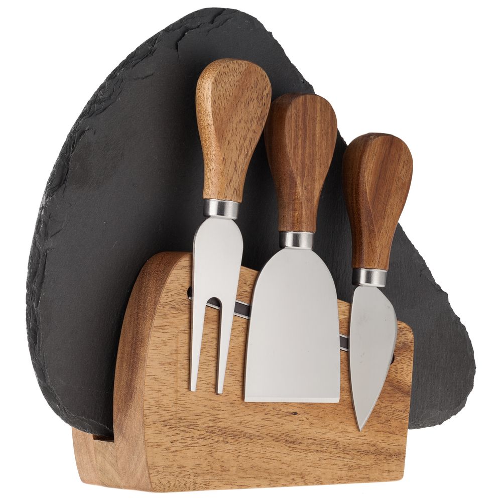 Подставка и рукоятки ножей выполнены из дерева акации, лезвия — из высококачественной нержавеющей стали.