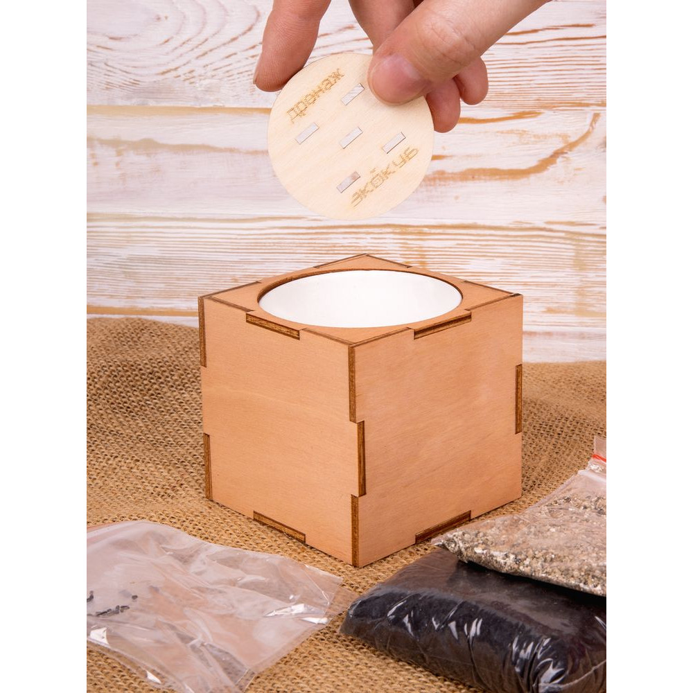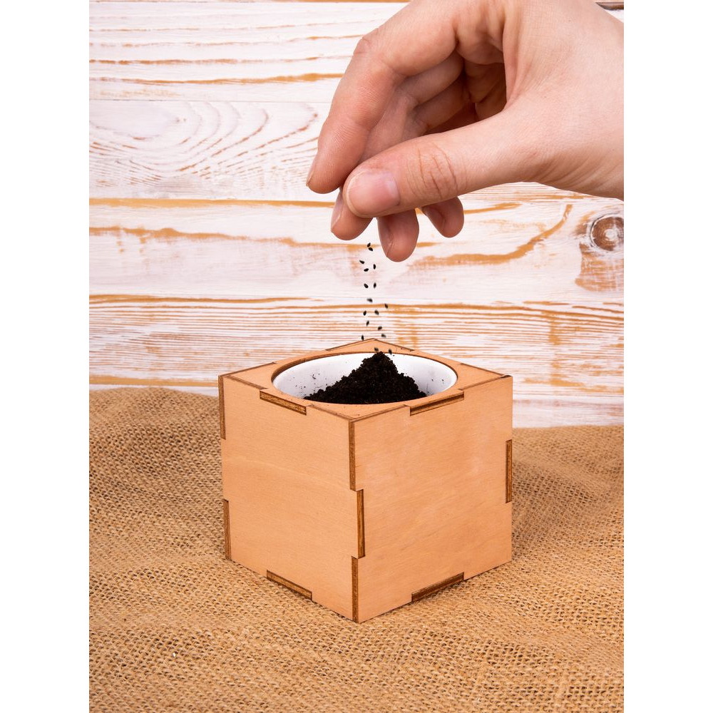 В наборе: деревянный куб, бумажный стаканчик, питательный грунт, семена, вермикулит.