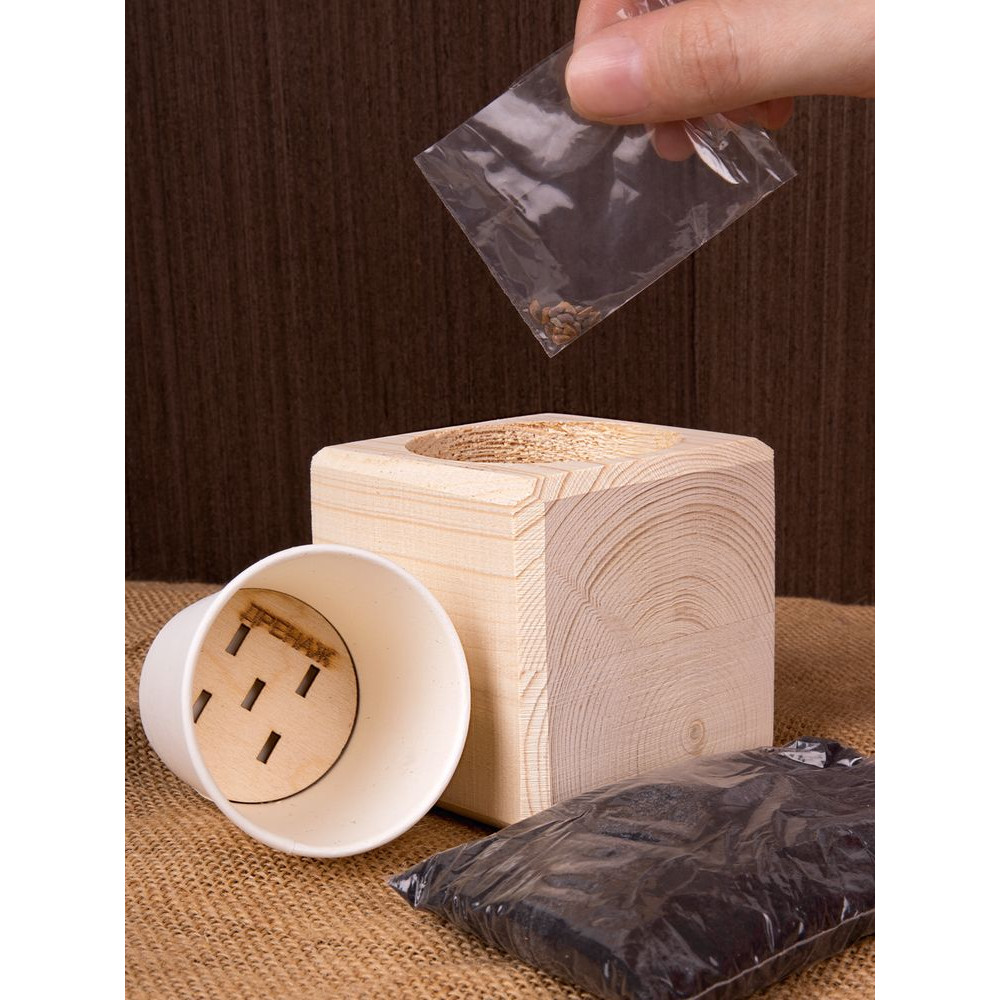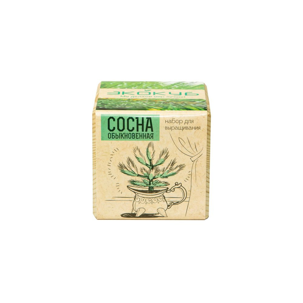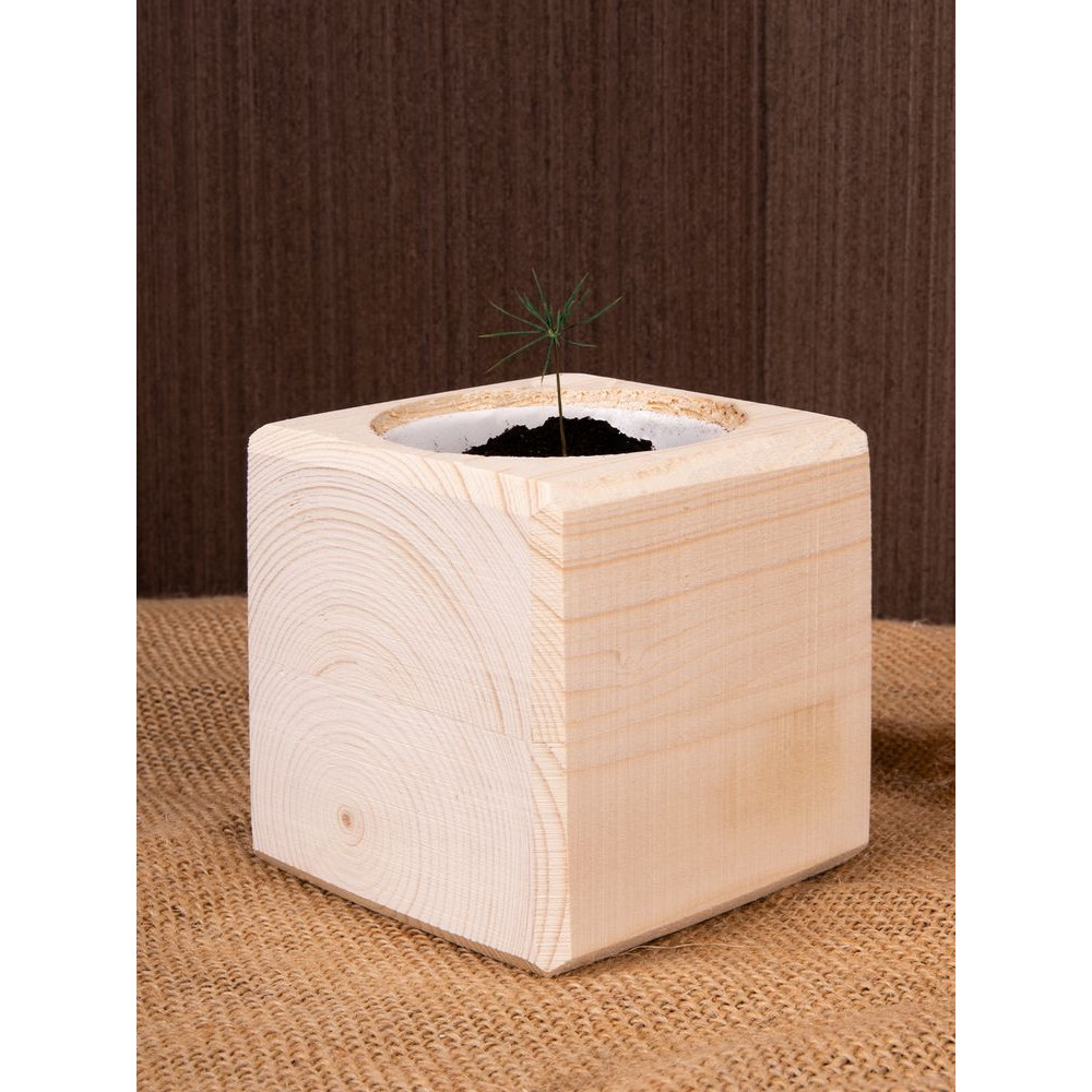 В наборе: деревянный куб, грунт, семена сосны.