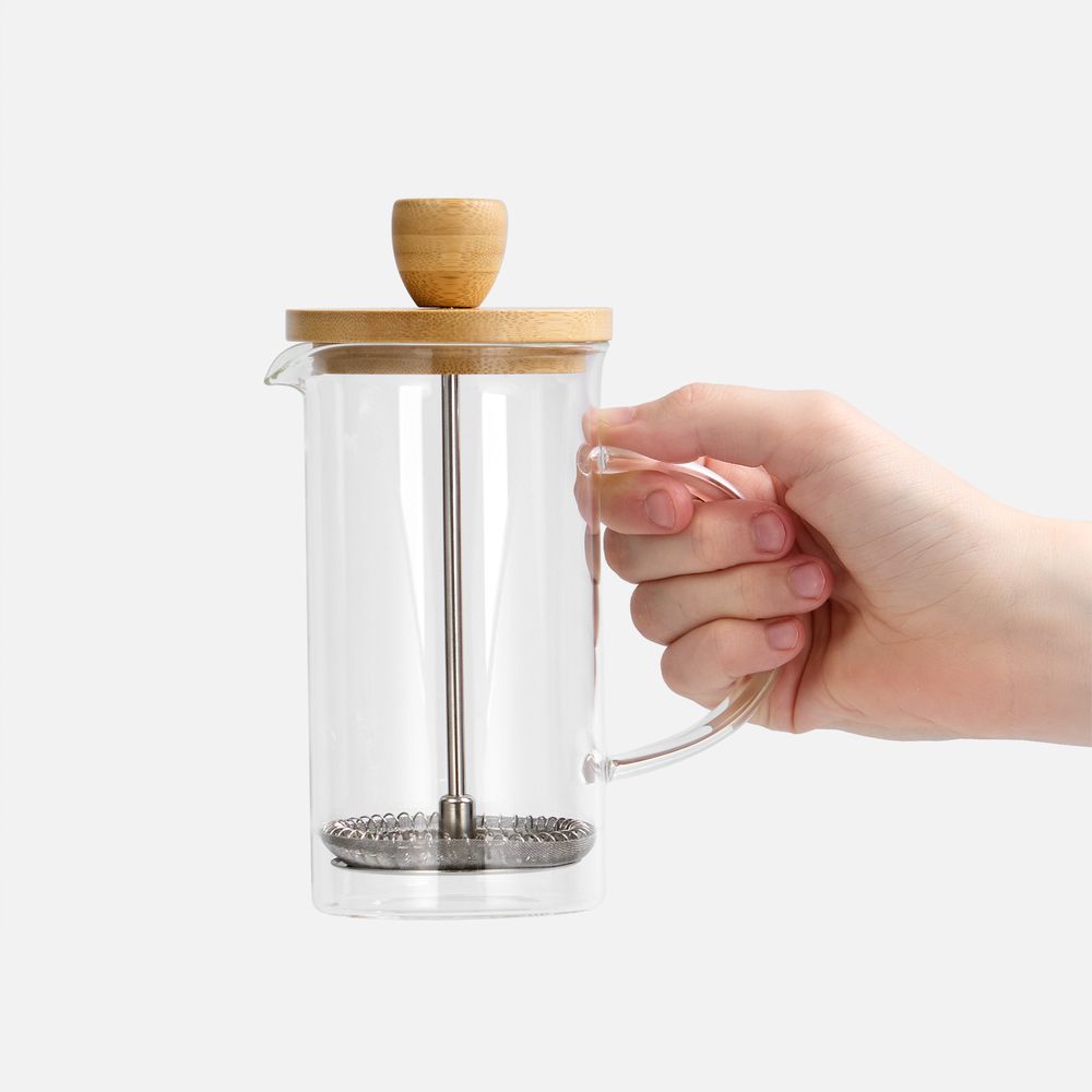 Френч-пресс с изящным сочетанием прозрачного боросиликатного стекла и натурального дерева станет стильным акцентом на кухне.