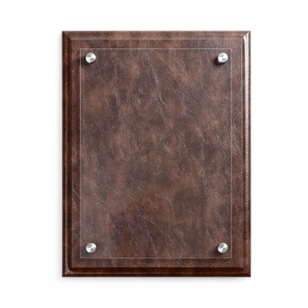 Классическая плакетка с имитирующей кожаную текстуру основой и акриловой вставкой — универсальный инструмент, чтобы рассказать о достижениях команды.