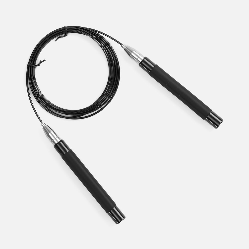 Легкие эргономичные алюминиевые ручки обеспечивают удобный захват, а полиуретановое покрытие предотвращает выскальзывание. Трос с сердцевиной из стального кабеля с гладкой оплеткой из ПВХ не запутывается при скоростном кручении, обеспечивая высокий контроль и управляемость. Система поворотных подшипников, установленная в ручках скакалки, обеспечивает равномерное вращение шнура на 360°.