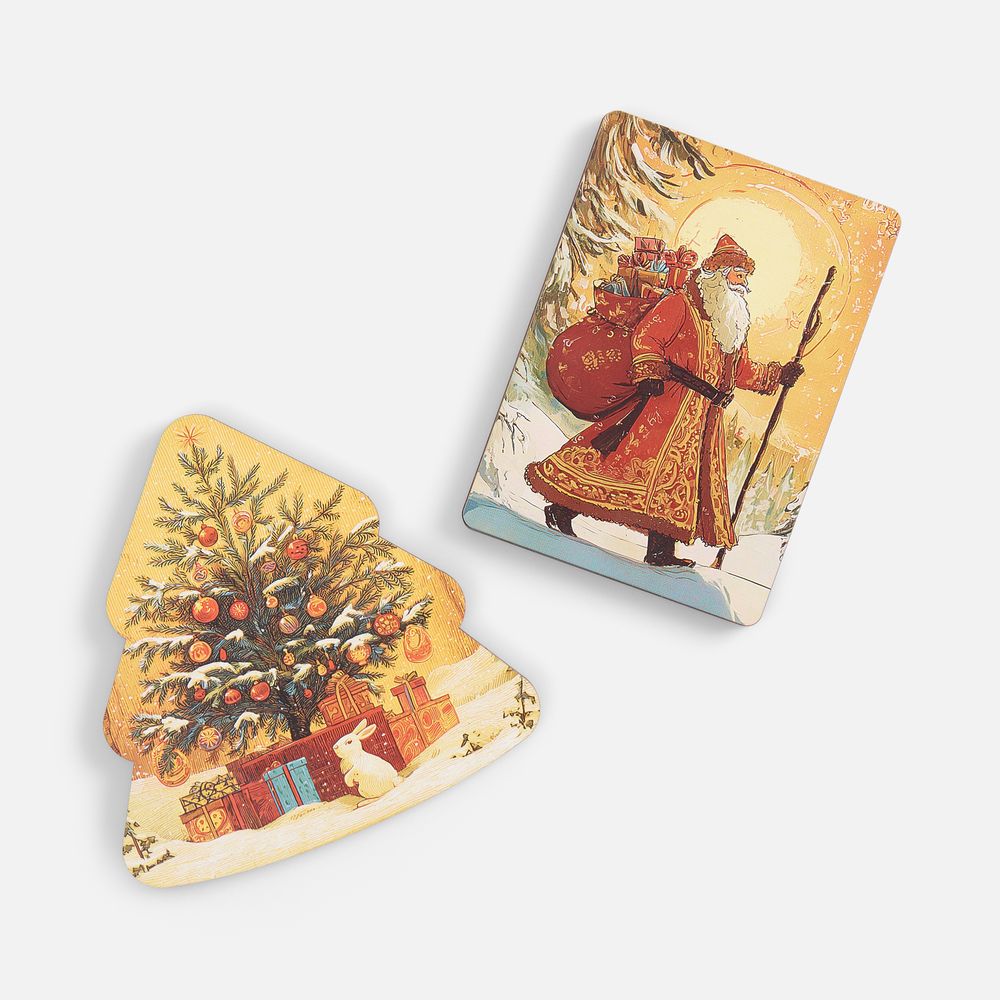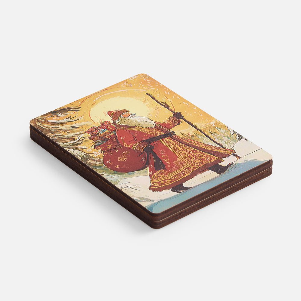Пазлы изготовлены из дерева, а сама новогодняя картинка оформлена в открыточном ретростиле. В центре композиции — величественный Дед Мороз с богатым мешком подарков, символизирующий радость Нового года. Это не просто подарки, но и наступающий год, щедрый на все самое хорошее: радость, достаток и впечатления.