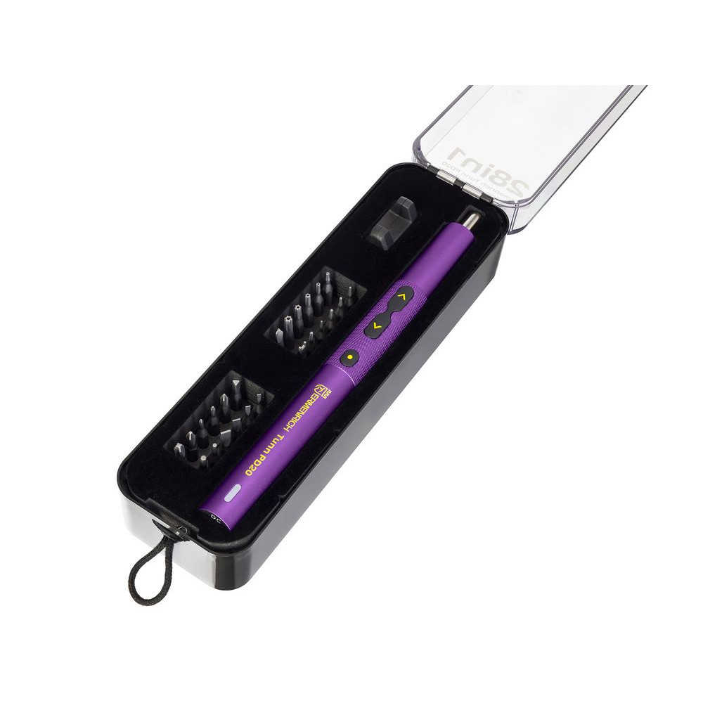В комплекте электрическая отвертка для точных работ, 24 биты, намагничиватель-размагничиватель, монтажная лопатка, кабель USB Type-C. Отвертка упакована в пластиковый кейс.