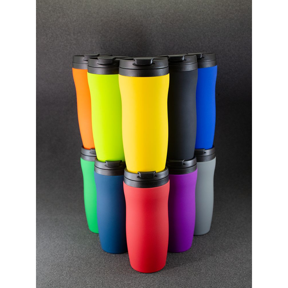 Двухслойная конструкция из нержавеющей стали снаружи и пищевого пластика внутри. Герметичная завинчивающаяся крышка с откидным клапаном для питья. Покрытие софт-тач. В отверстие в крышке можно вставить шнурок для удобного ношения стакана на руке. Шнурок в комплект не входит.