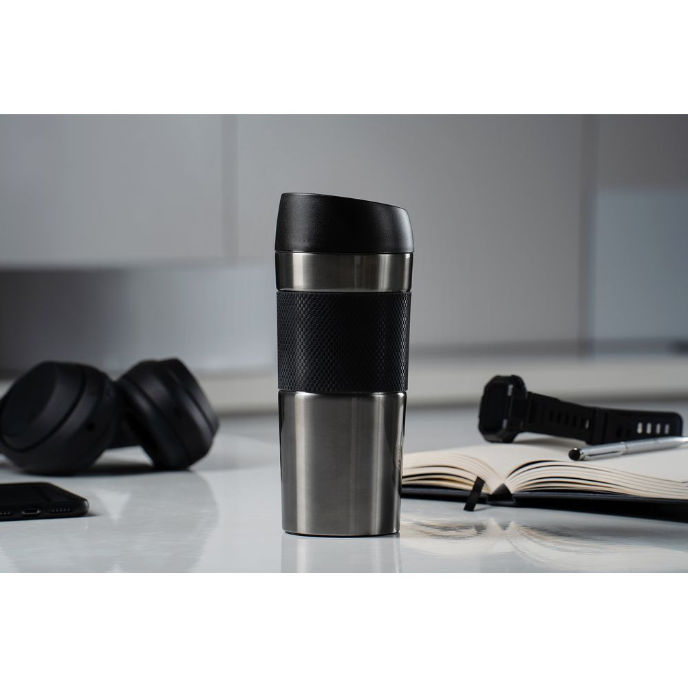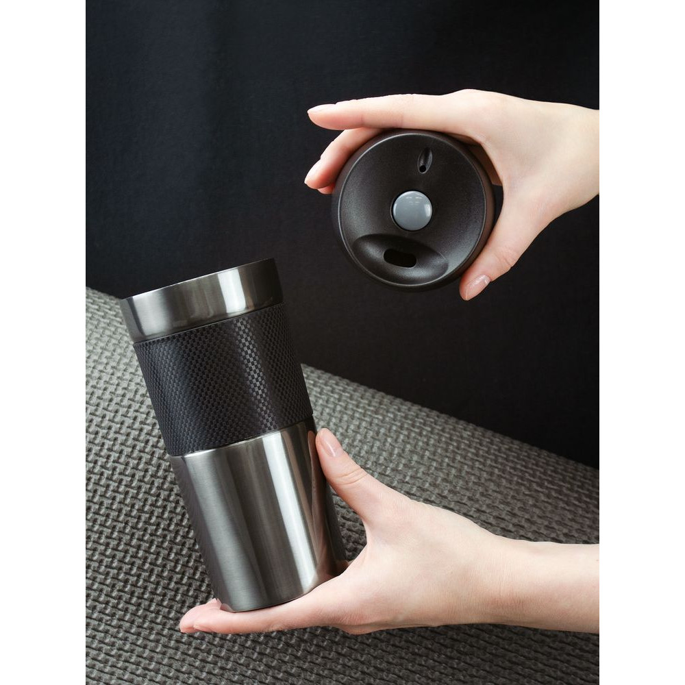 Удобная крышка с кнопкой-закрывашкой и силиконовая манжета на корпусе — все, что нужно, чтобы максимально комфортно пить чай или кофе в дороге.
