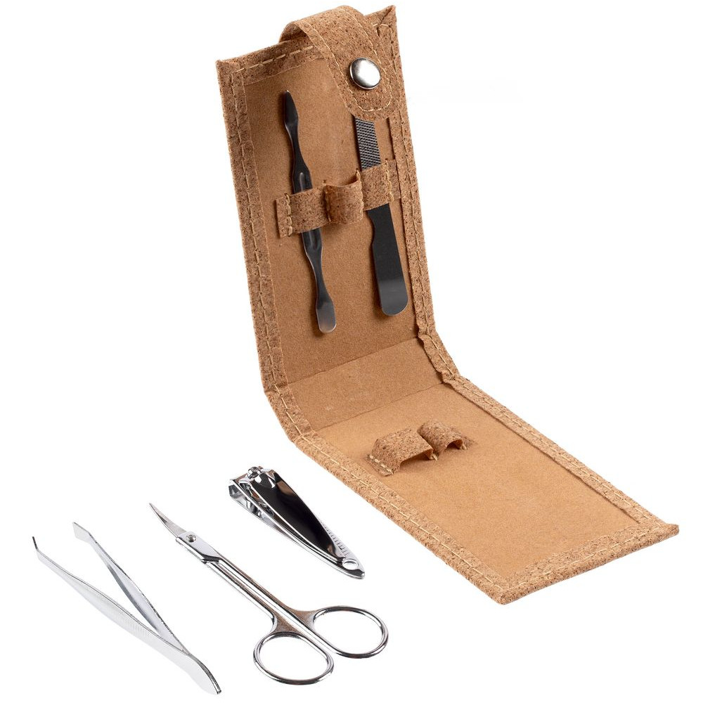 Набор для маникюра в футляре из пробки с 5 инструментами из нержавеющей стали: пилкой, ножницами, кусачками для ногтей, пинцетом и лопаткой для кутикулы.