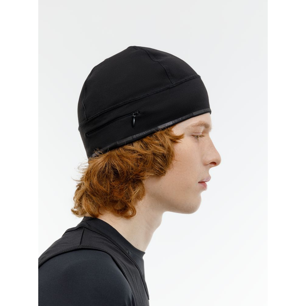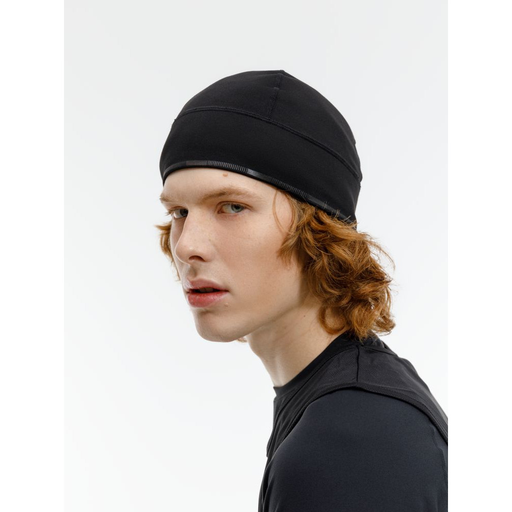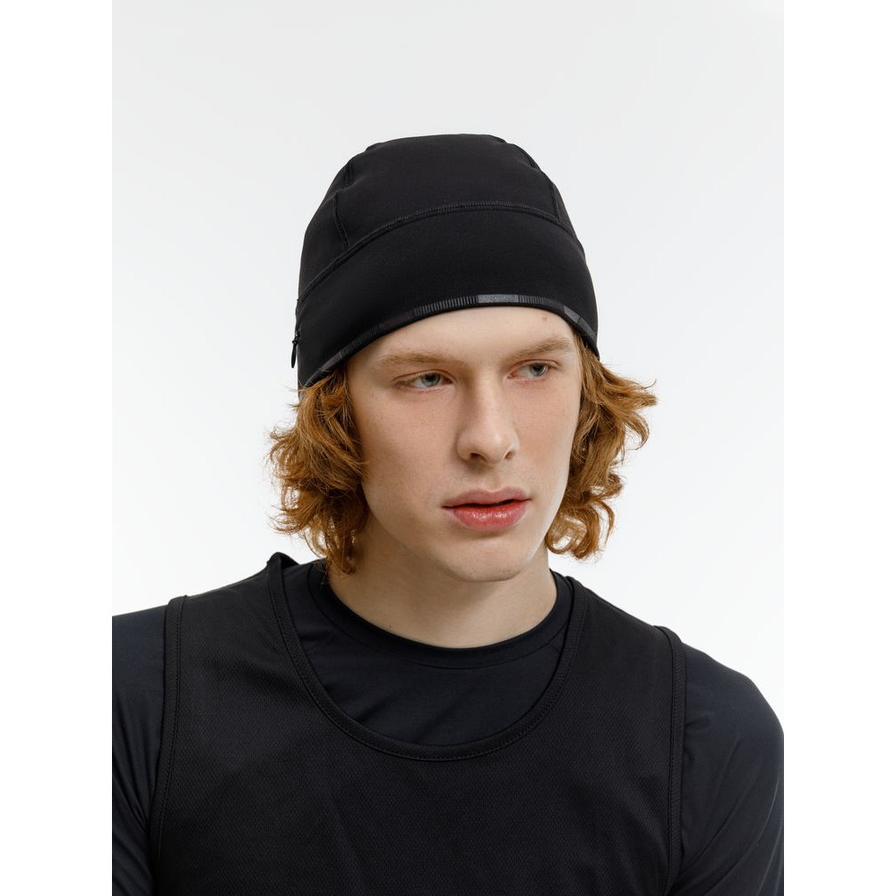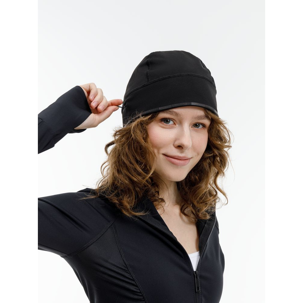 Шапка выполнена в черном цвете, но имеет светоотражающую полосу вдоль края, что улучшает видимость спортсмена в условиях плохой освещенности.
